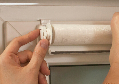 - Пружинный крепеж. Демонтаж начинается со сворачивания полотнища в рулон и снятия декоративных боковых заглушек. Затем нужно вынуть шестерни, находящиеся на краю вала с противоположной стороны от цепочки управления. Теперь можно убрать полотнище с вала. Для этого нужно сдвинуть карниз со стороны управляющей цепочки.