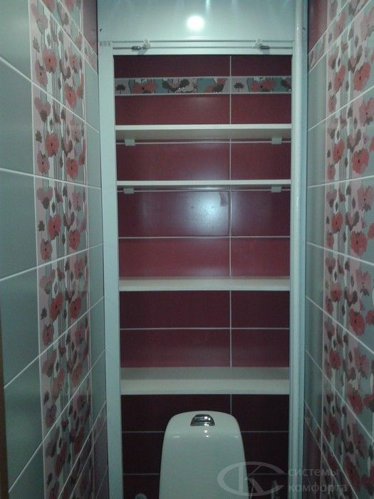 Если площадь помещения позволяет установить панель, имитирующую стену, можно без ущерба для комфорта, сделать функциональную фальшивую стену: прикрепить к ней полки. На них хорошо размещаются моющие средства, бытовая химия, другие хозяйственные мелочи.