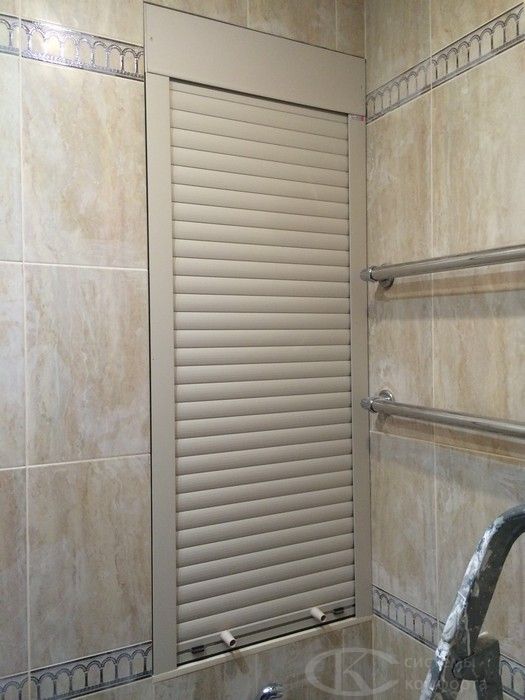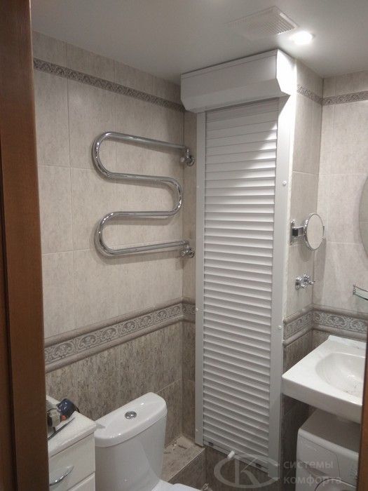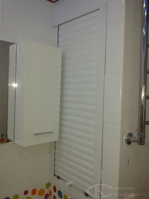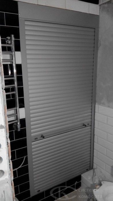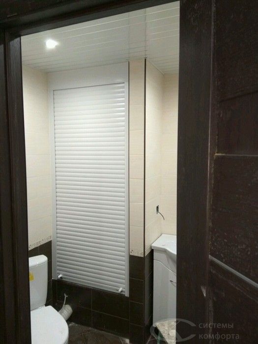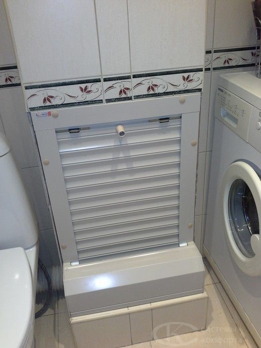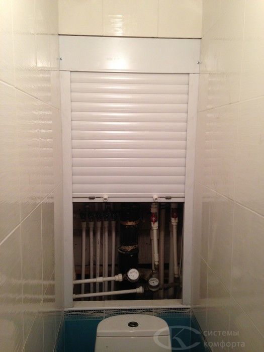 Для того, чтобы сделать качественный дизайн санузла, удачно скрыв трубы, также используют рольставни. Они отличаются прочностью и служат долгое время. Конструкция имеет автоматическое управление с помощью дистанционного пульта или специальной кнопки. Ставни легко и быстро открываются.