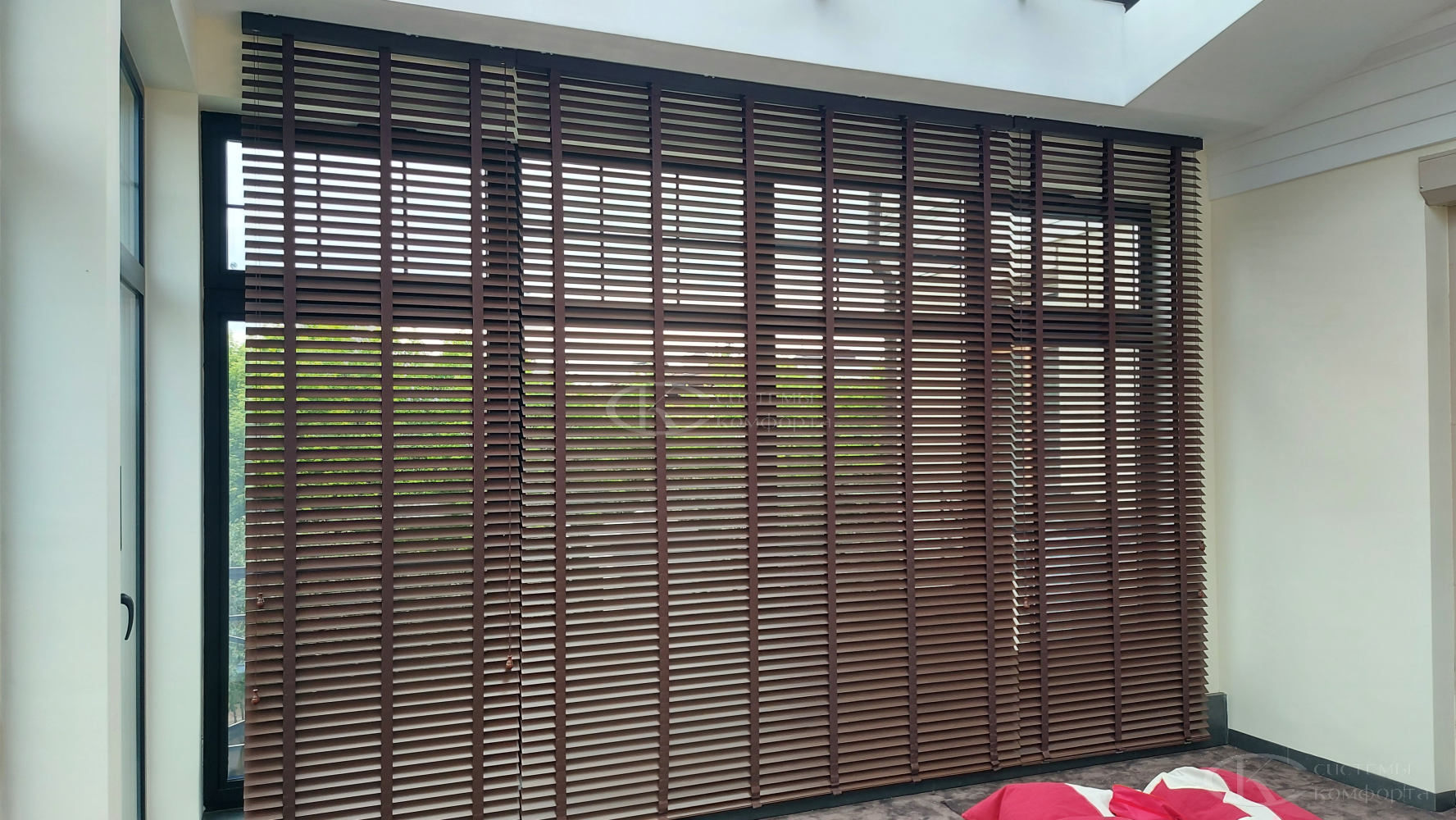- Деревянные жалюзи. Элитный сегмент с неповторимой аурой экологичности. Изготавливаются из легких пород. Создают в комнате уют, тепло, снижают уровень отраженного шума. Требуют аккуратного ухода и защиты от высокой влажности. Идеальный выбор для гостиной или спальни в эко- или классическом стиле.