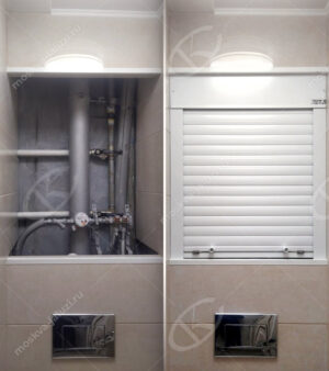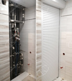 Рольставни в туалете ставят вместо дверок сантехнического шкафа. Они скрывают трубы, счетчики, водонагреватель, а металлические профили с наполнителем обеспечивают необходимую шумоизоляцию и смотрятся эстетично. Такая система компактна и при этом предоставляет возможность легко и быстро открыть сантехническую нишу для осмотра или ремонта коммуникаций.