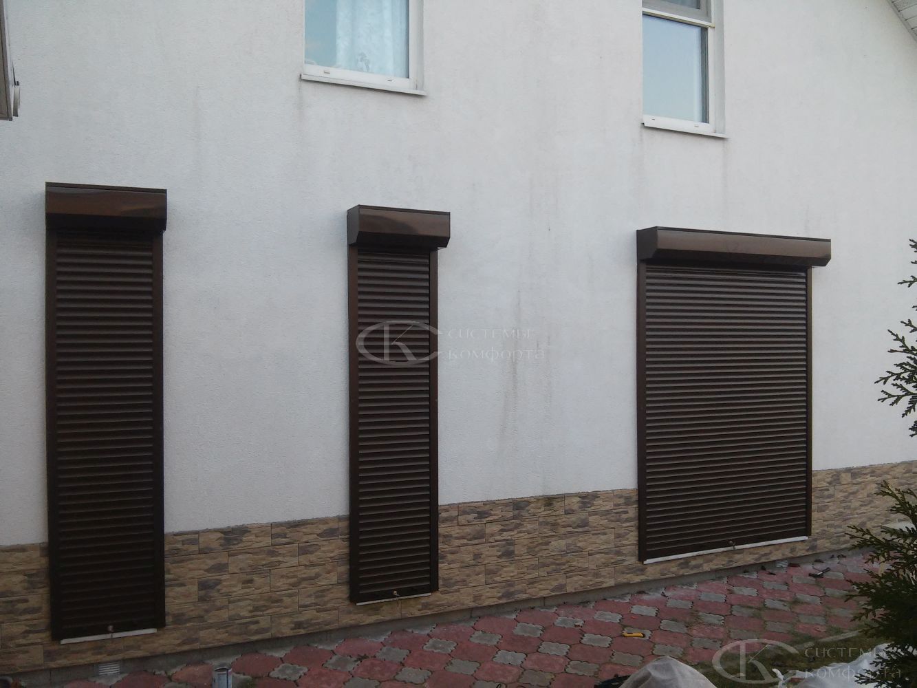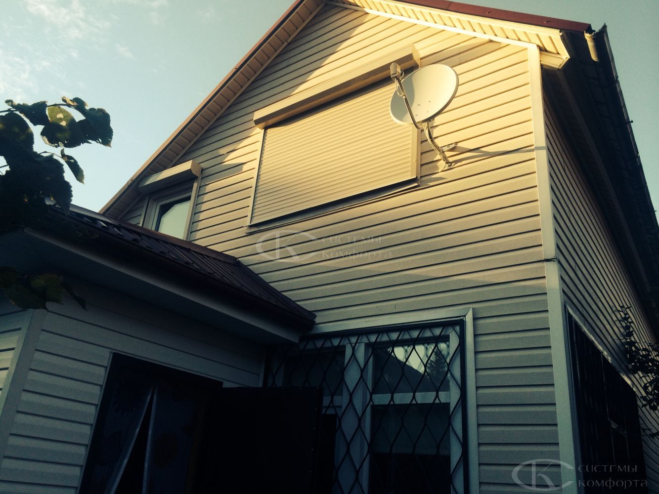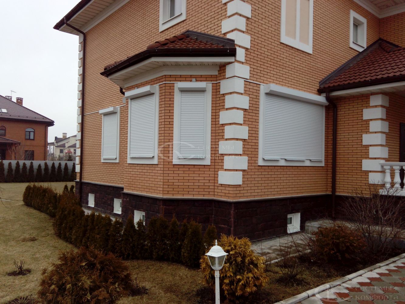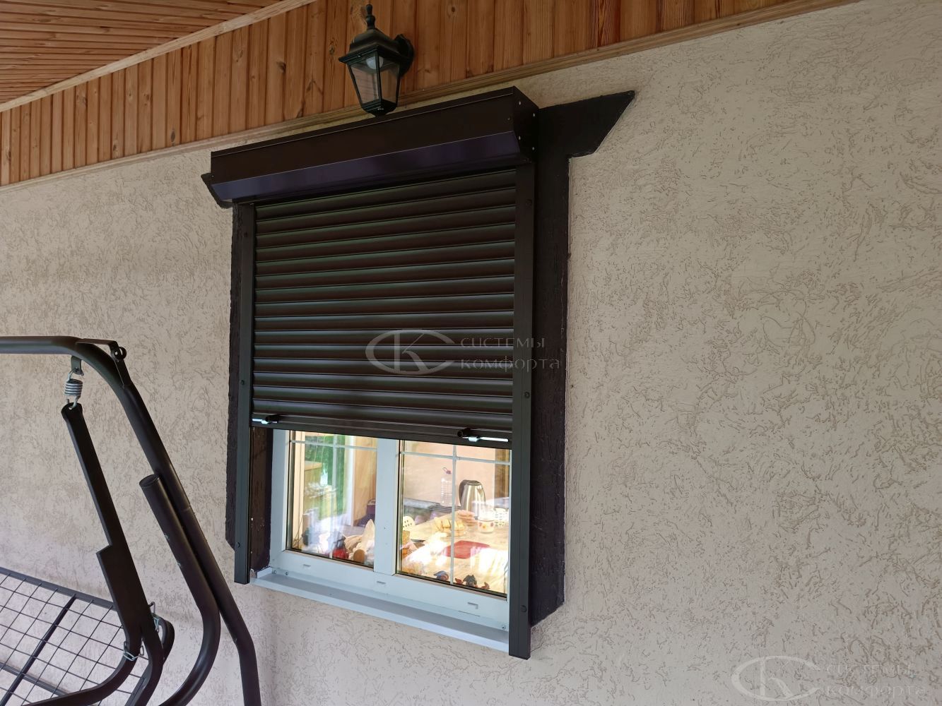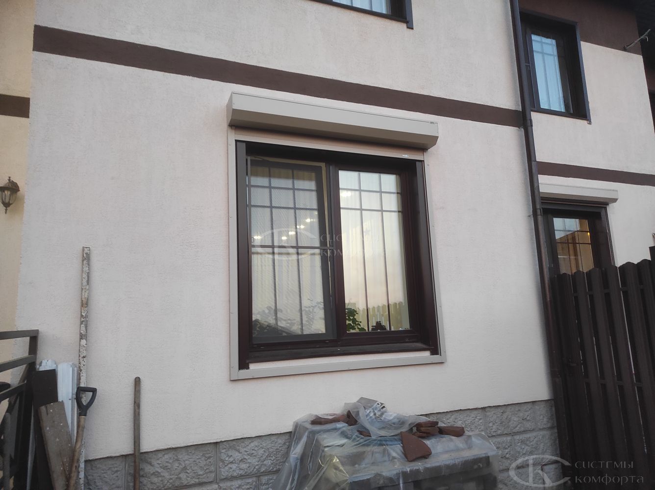 Короб рольставен монтируется на фасад здания выше проема, направляющие — по бокам окна. Такой способ не влияет на объем света, попадающего в помещение, а сами роллеты в открытом положении не видны из дома. Недостаток решения: конструкция выступает относительно наружной стены и может внести дисгармонию в архитектурный облик здания.