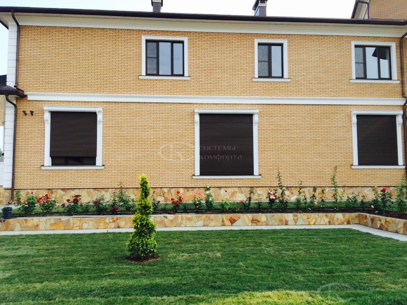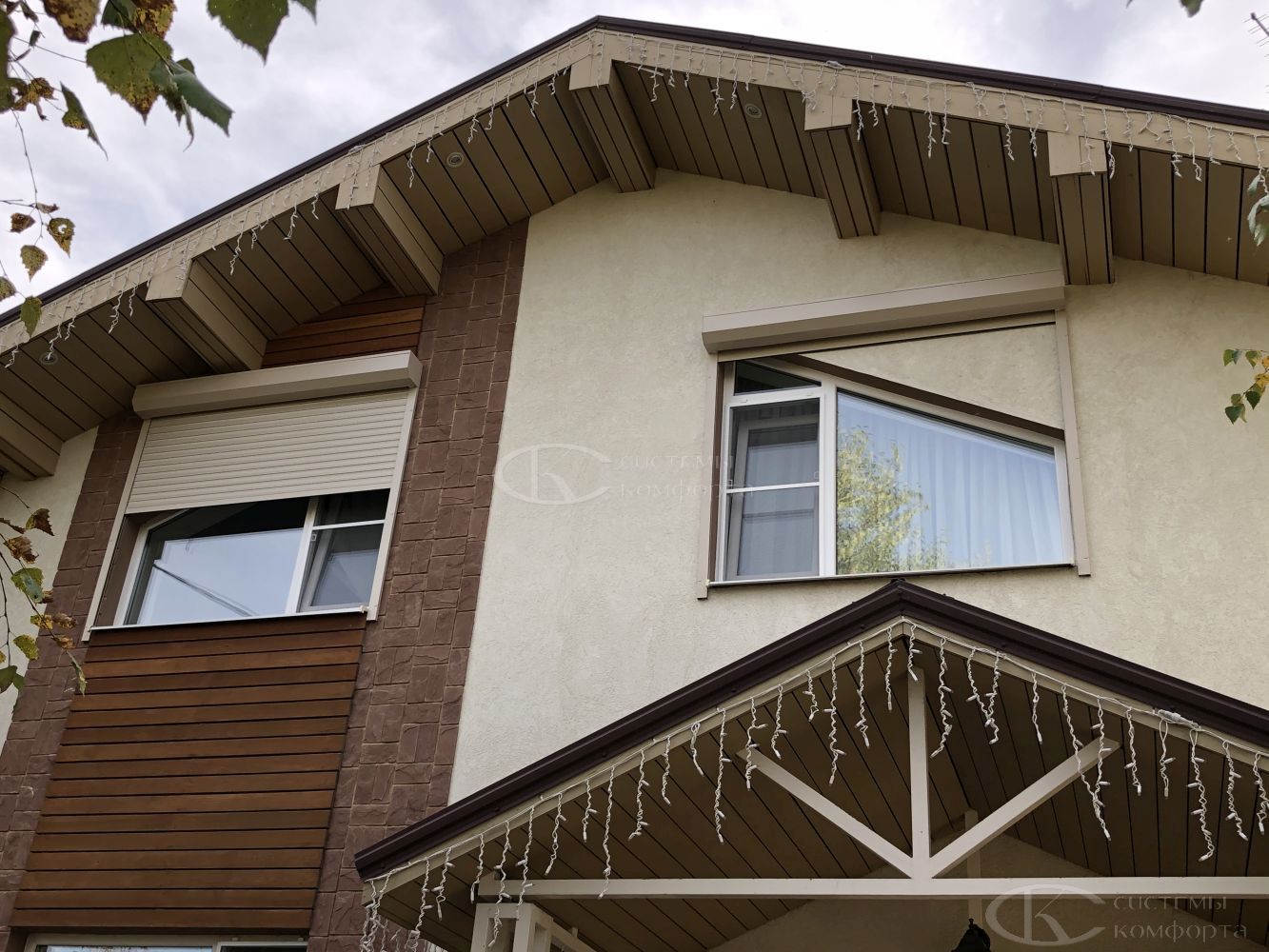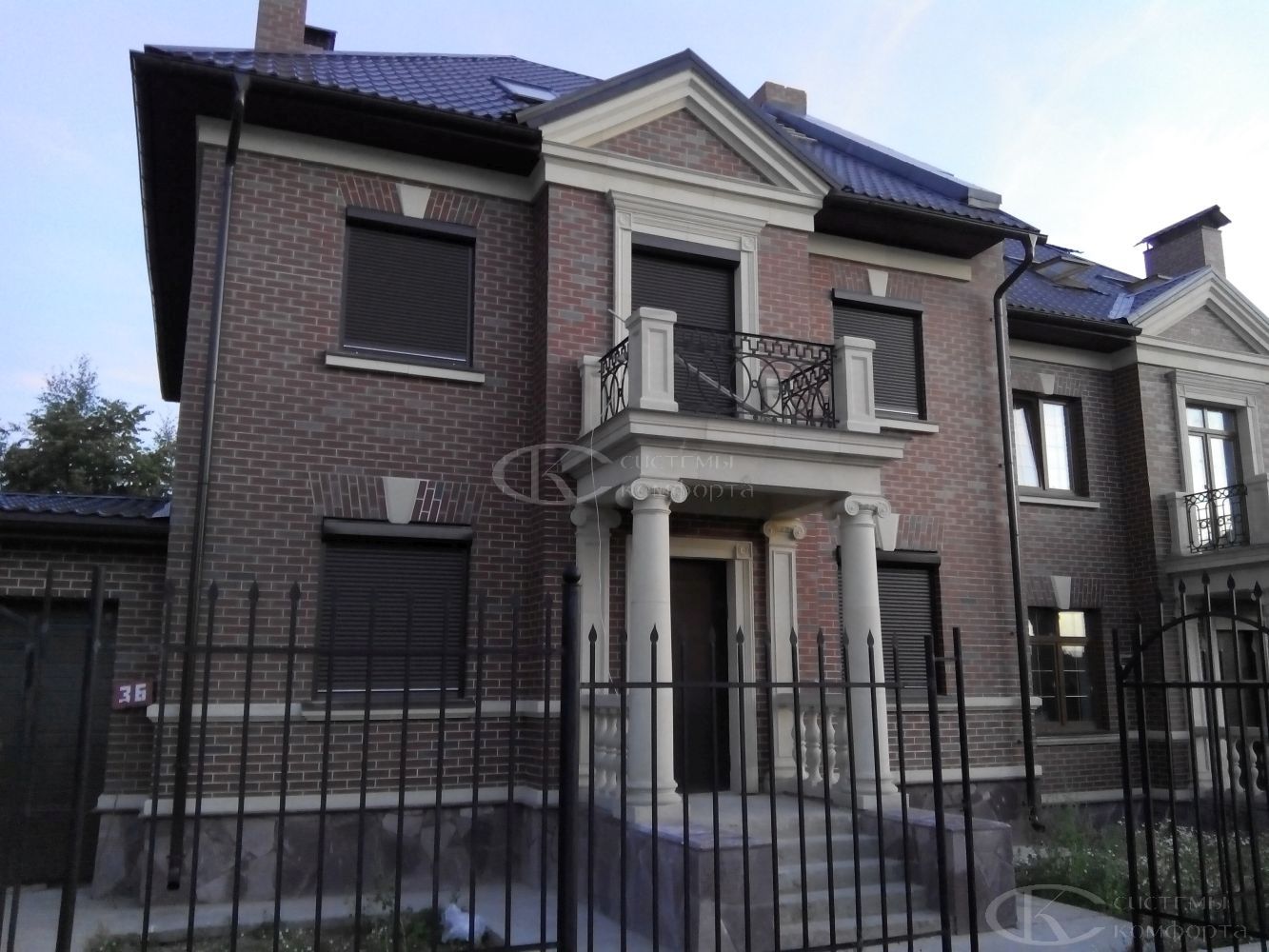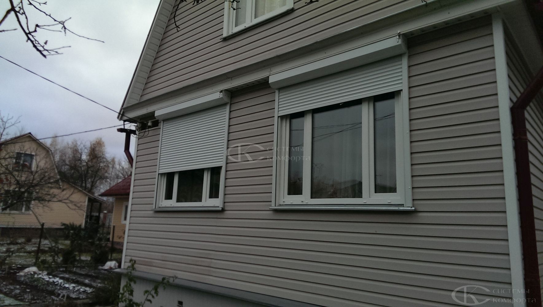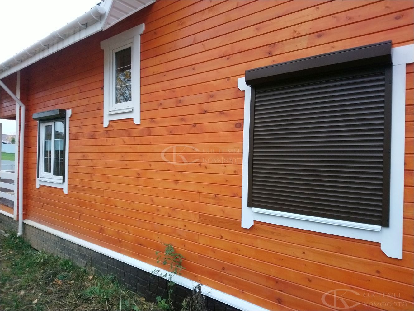 Короб рольставен монтируется на фасад здания выше проема, направляющие — по бокам окна. Такой способ не влияет на объем света, попадающего в помещение, а сами роллеты в открытом положении не видны из дома. Недостаток решения: конструкция выступает относительно наружной стены и может внести дисгармонию в архитектурный облик здания.