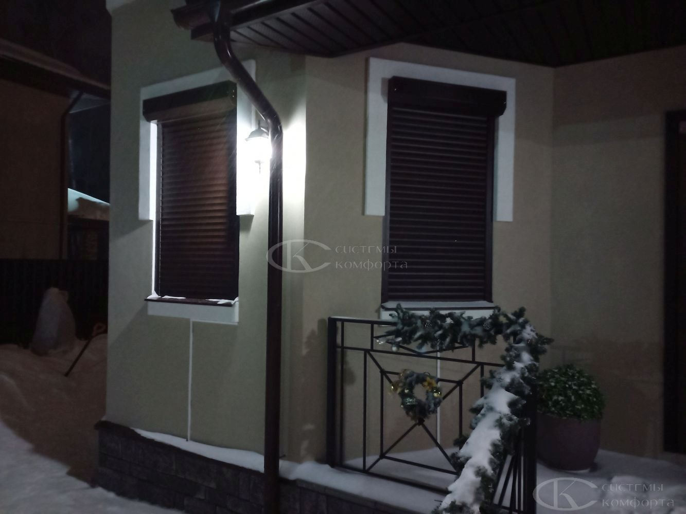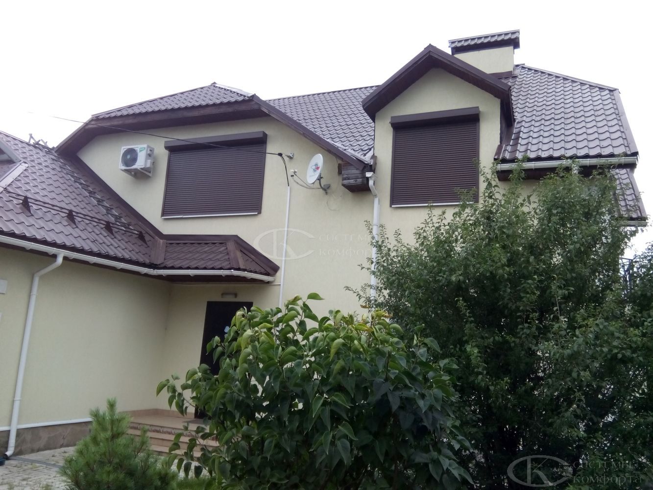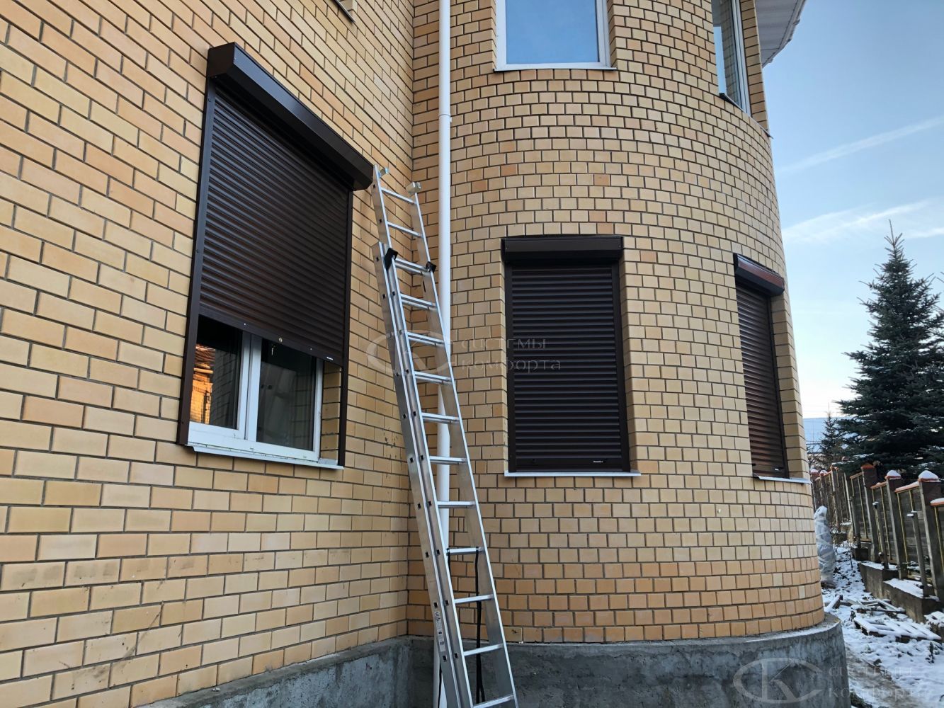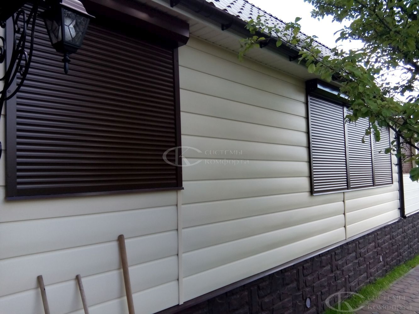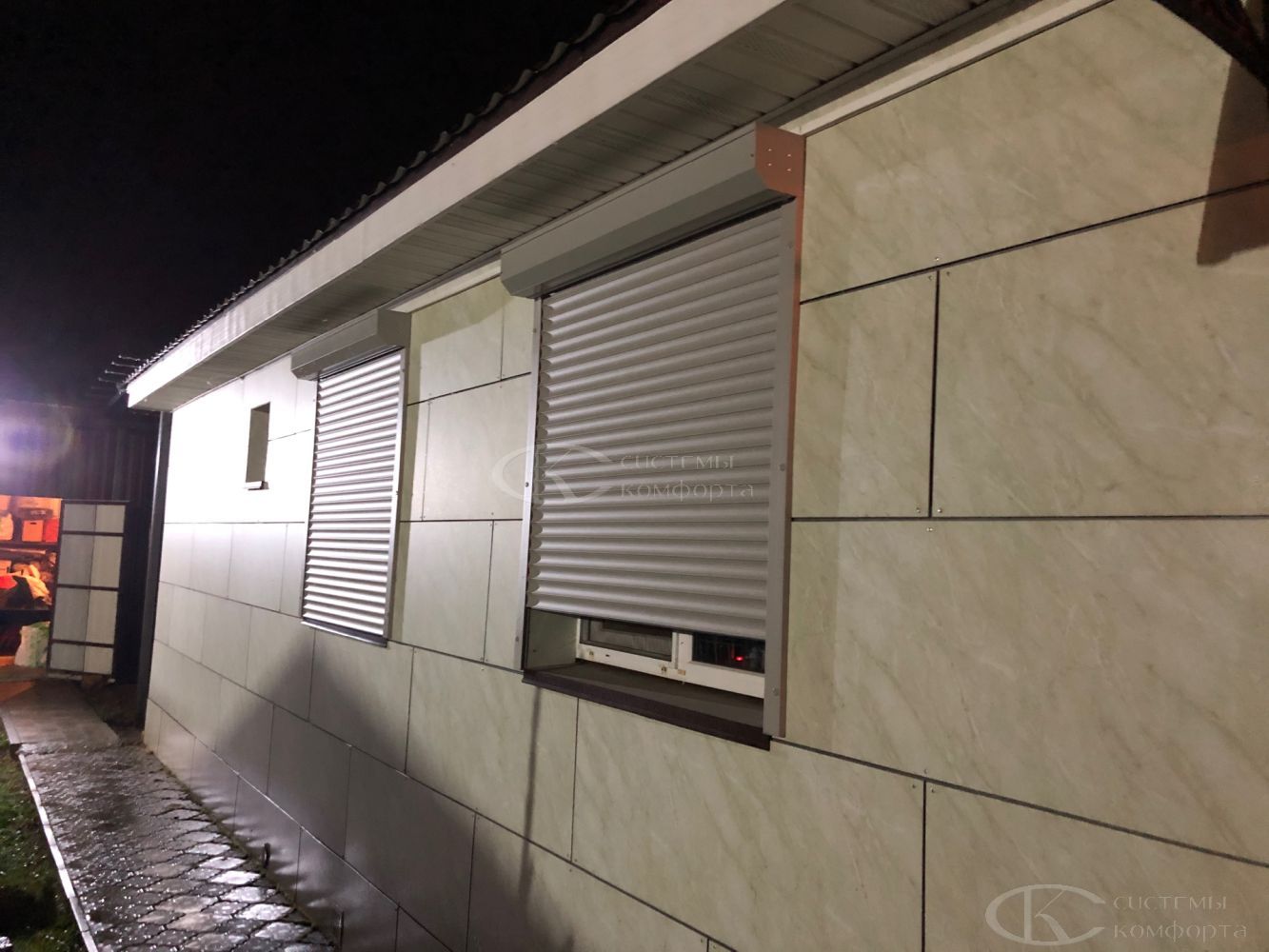 Короб рольставен монтируется на фасад здания выше проема, направляющие — по бокам окна. Такой способ не влияет на объем света, попадающего в помещение, а сами роллеты в открытом положении не видны из дома. Недостаток решения: конструкция выступает относительно наружной стены и может внести дисгармонию в архитектурный облик здания.