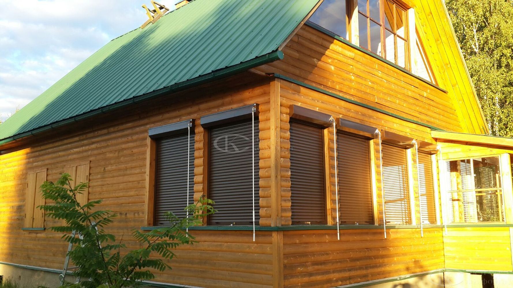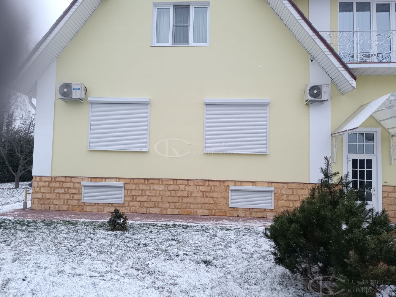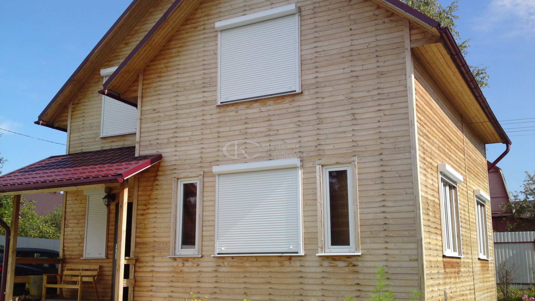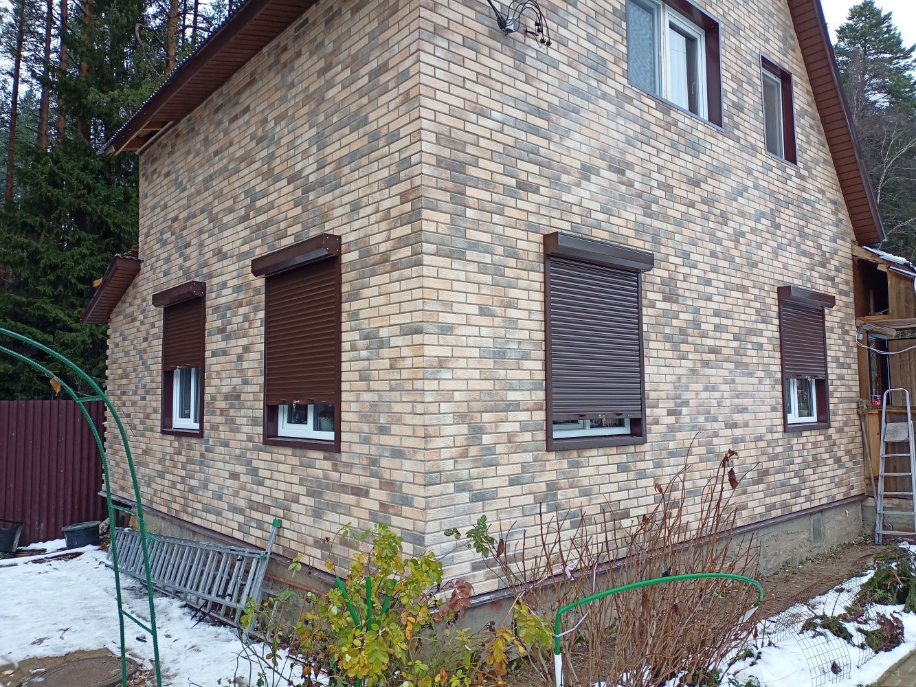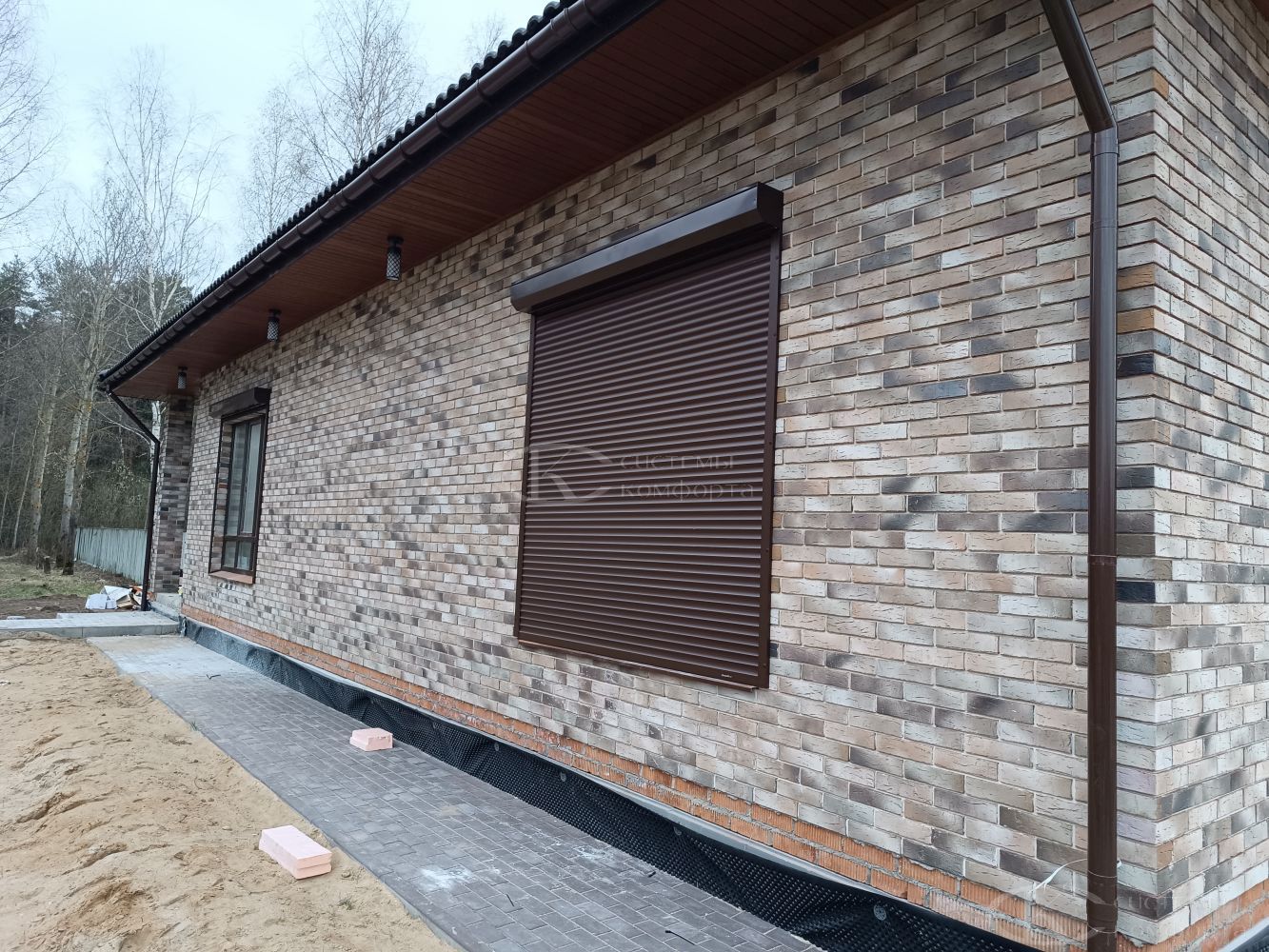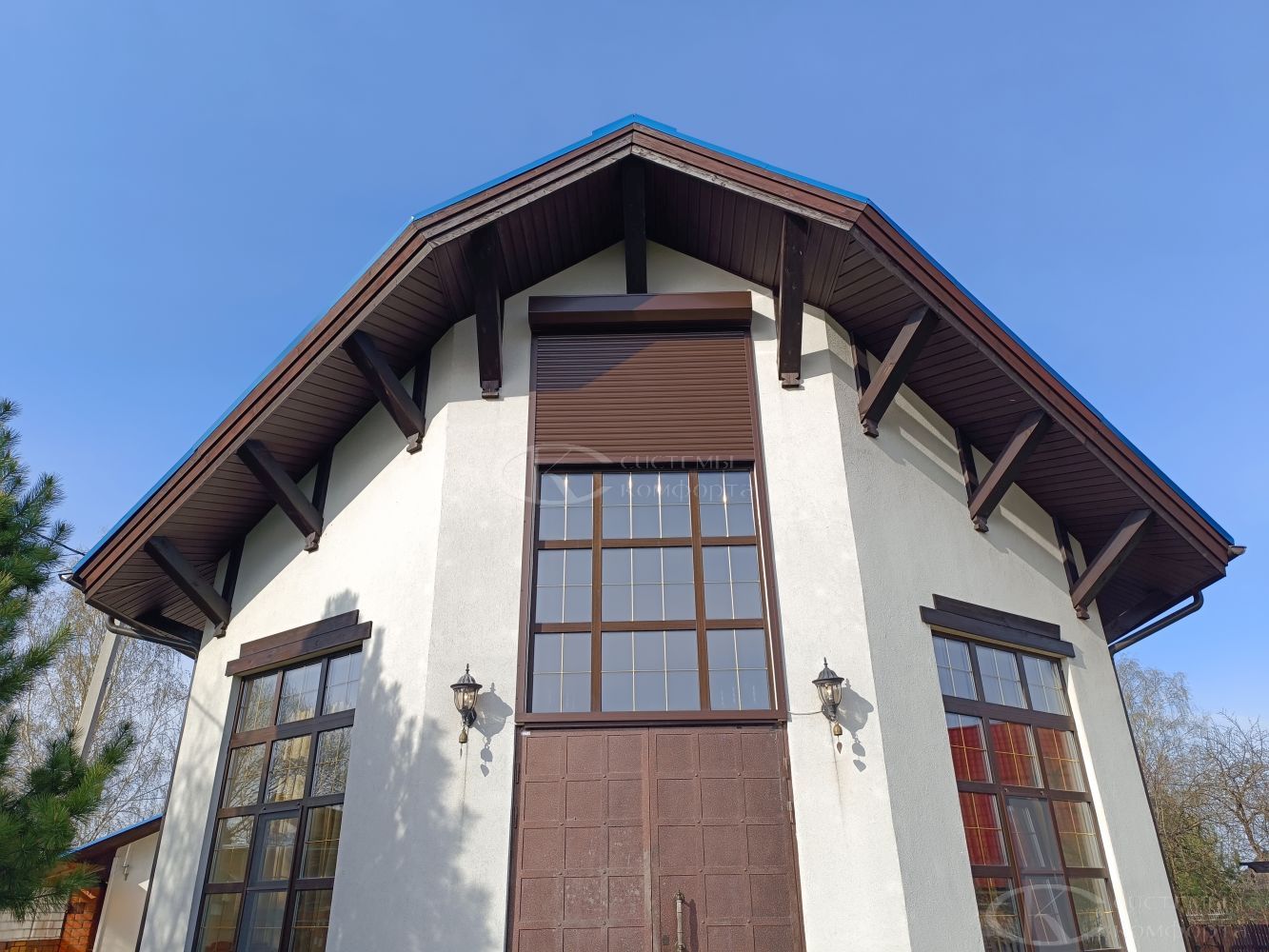 Короб рольставен монтируется на фасад здания выше проема, направляющие — по бокам окна. Такой способ не влияет на объем света, попадающего в помещение, а сами роллеты в открытом положении не видны из дома. Недостаток решения: конструкция выступает относительно наружной стены и может внести дисгармонию в архитектурный облик здания.