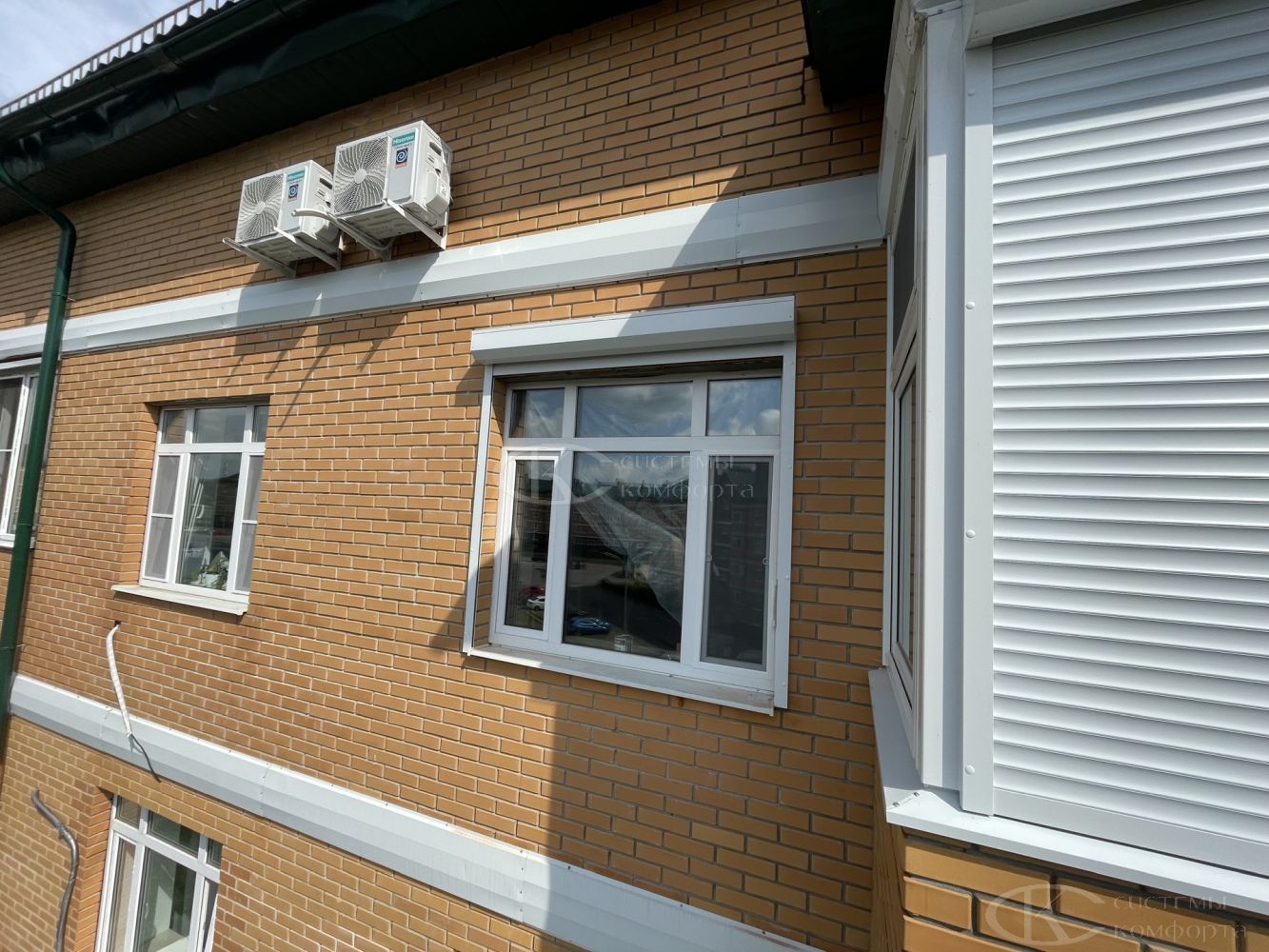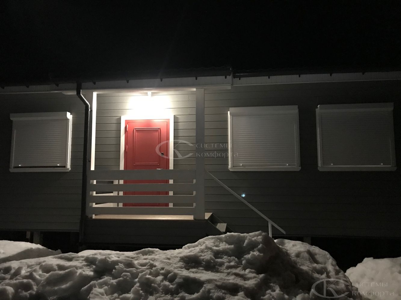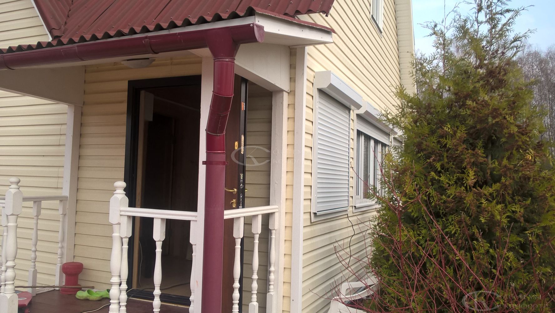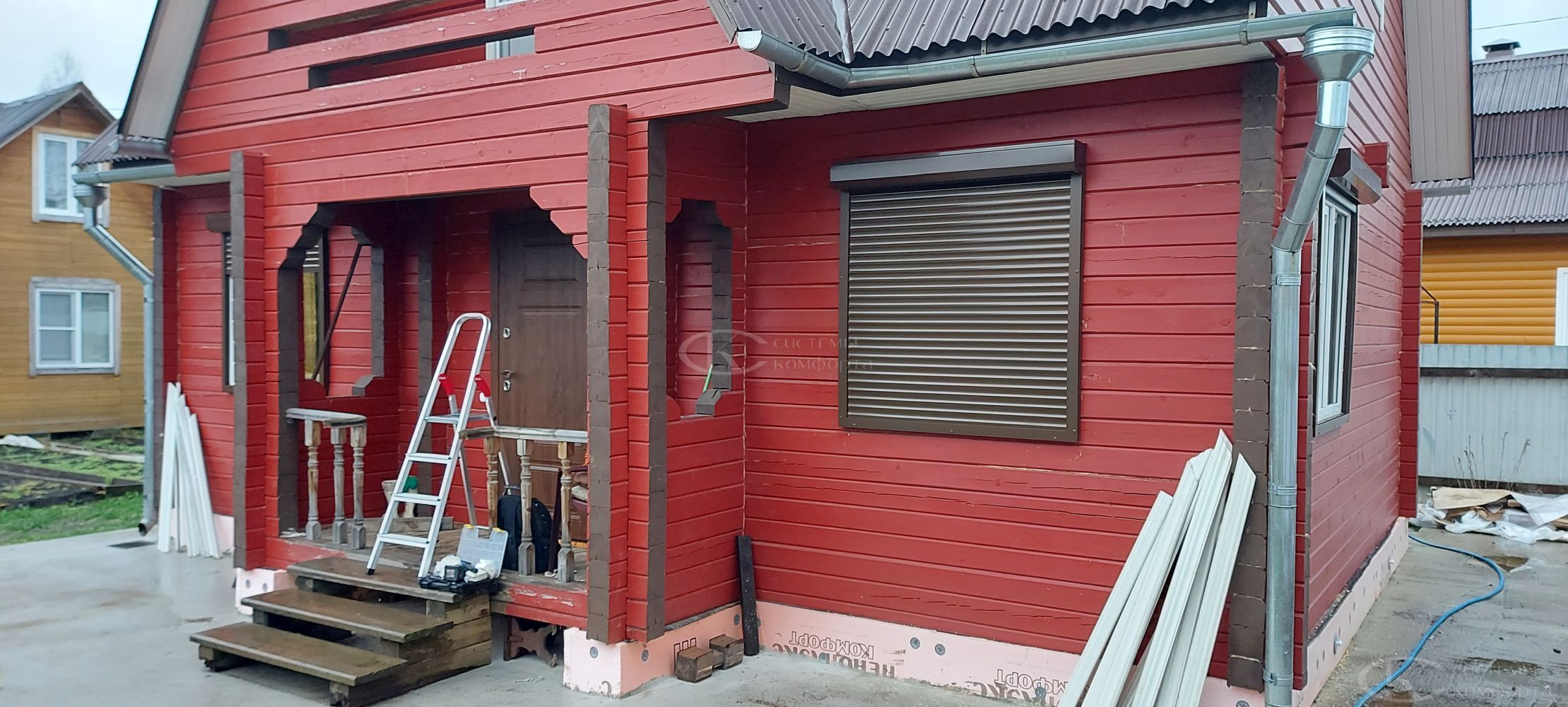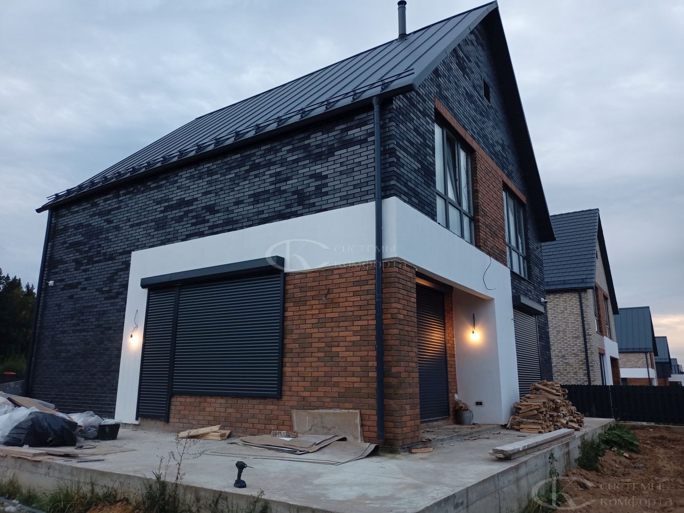 Короб рольставен монтируется на фасад здания выше проема, направляющие — по бокам окна. Такой способ не влияет на объем света, попадающего в помещение, а сами роллеты в открытом положении не видны из дома. Недостаток решения: конструкция выступает относительно наружной стены и может внести дисгармонию в архитектурный облик здания.