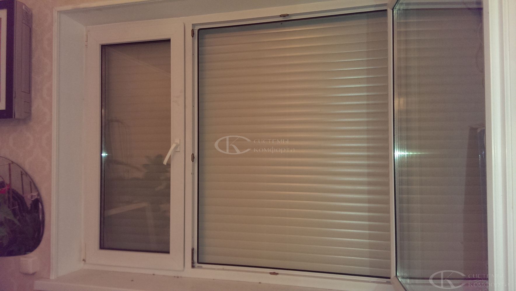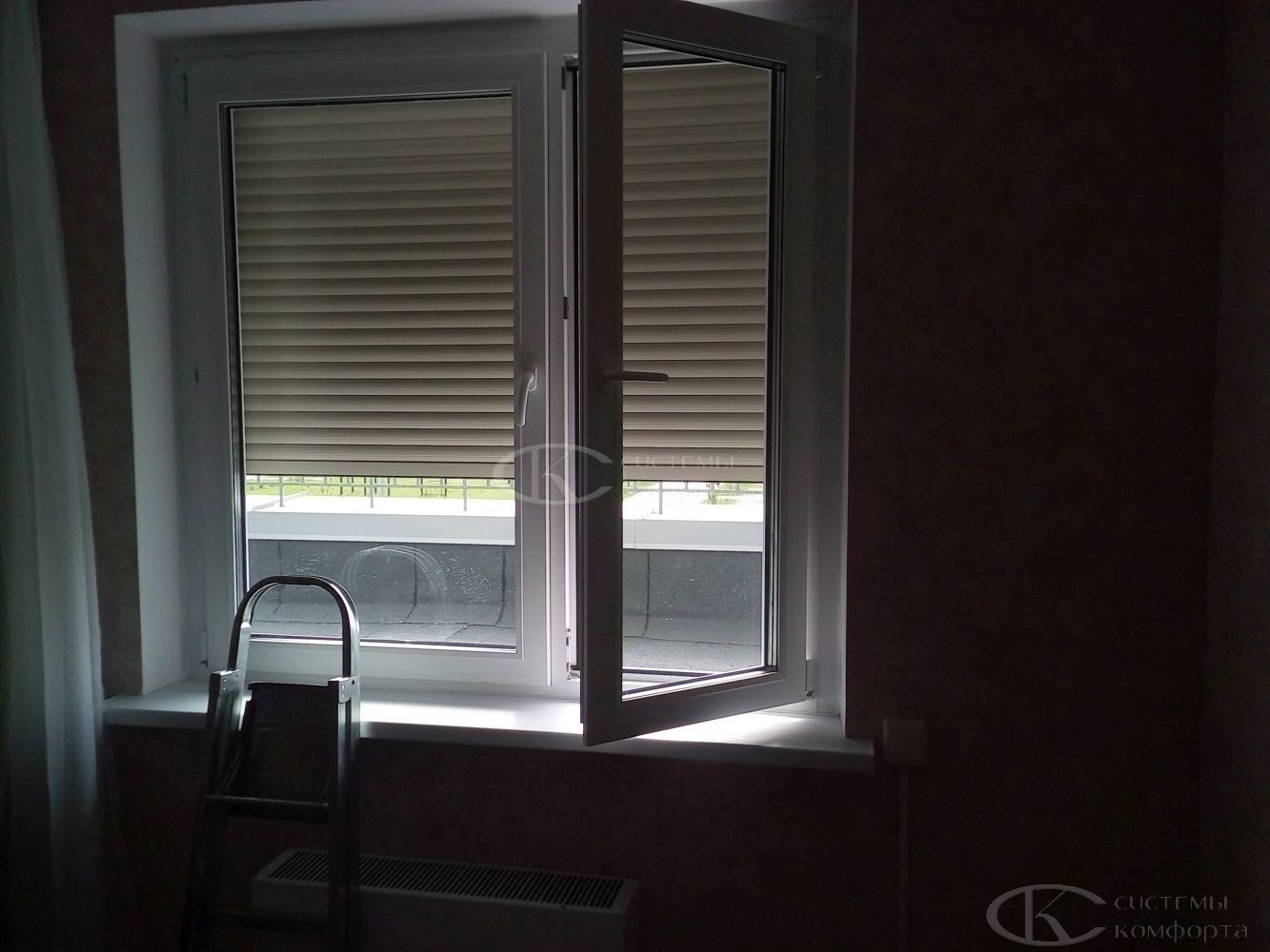 Роллетная система устанавливается в одной плоскости с проемом (все элементы крепятся к его торцевым частям), кожух с полотном повернут внутрь. В этом случае детали конструкции не выступают за пределы окна, что улучшает эстетику строения. Однако между роллетами и оконными створками образуется зазор, равный величине кожуха.