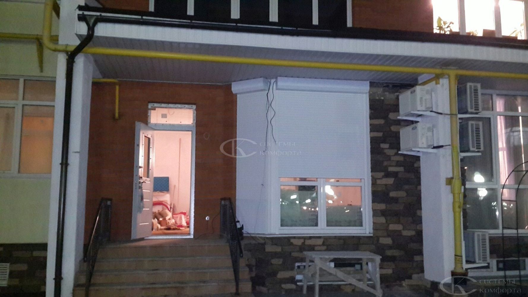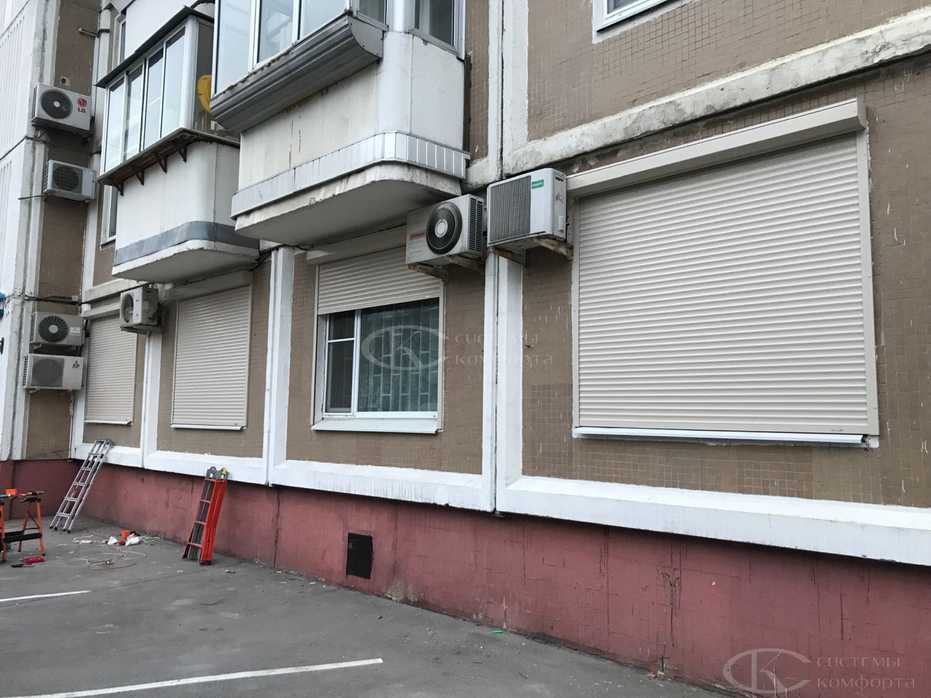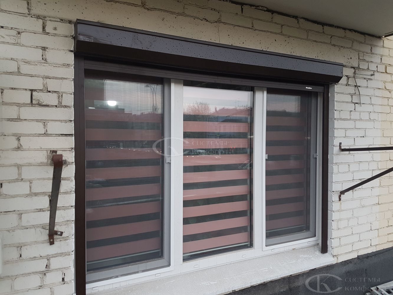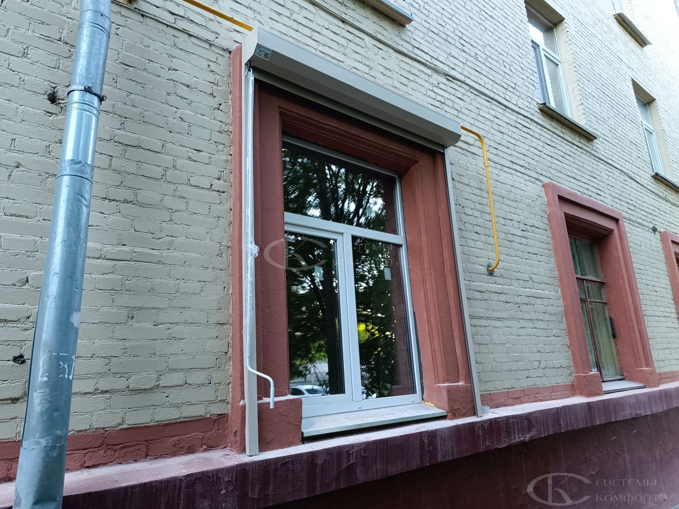 Роллеты устанавливаются в проем, направляющие крепятся к его торцевым частям, короб с полотном развернут наружу. Кожух не выступает за пределы окна, поэтому внешний вид здания остается неизменным. Однако при таком способе установки объем светового потока уменьшается на высоту короба и ширину направляющих шин.