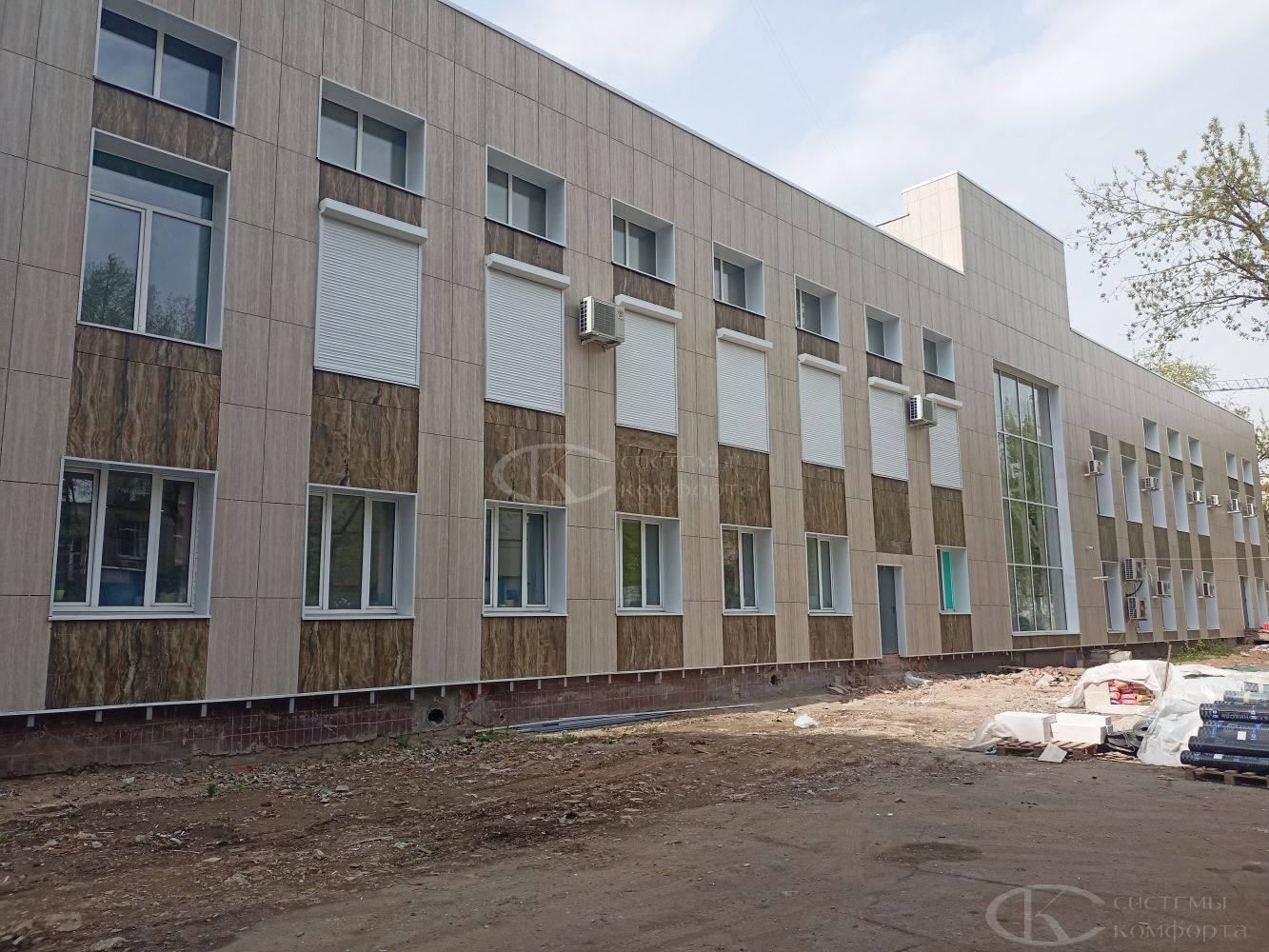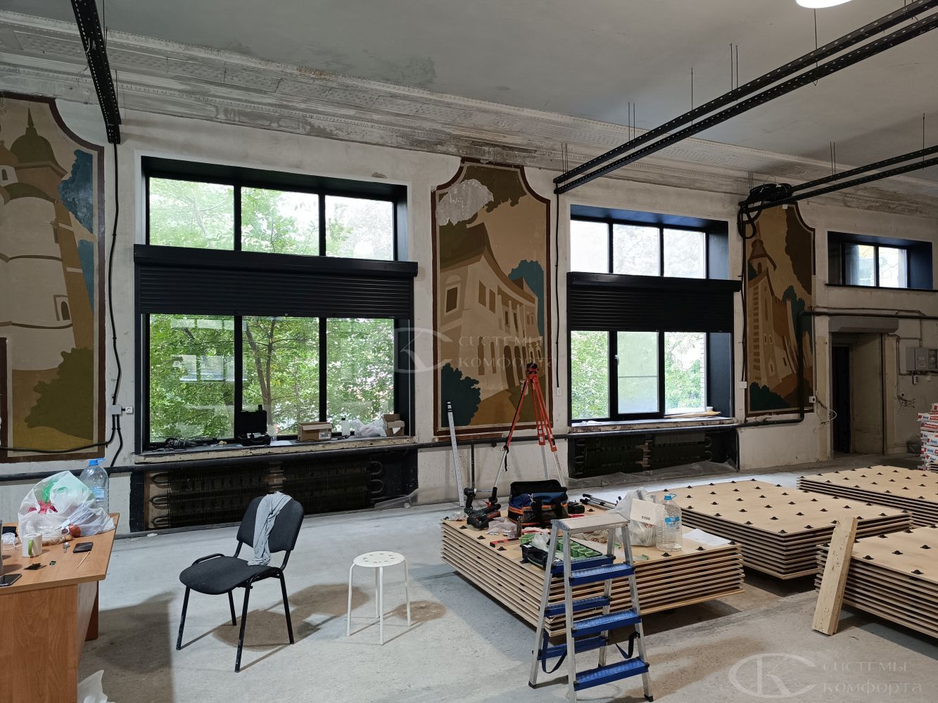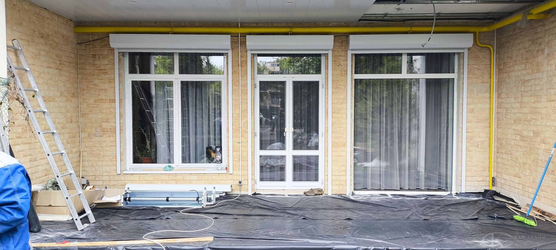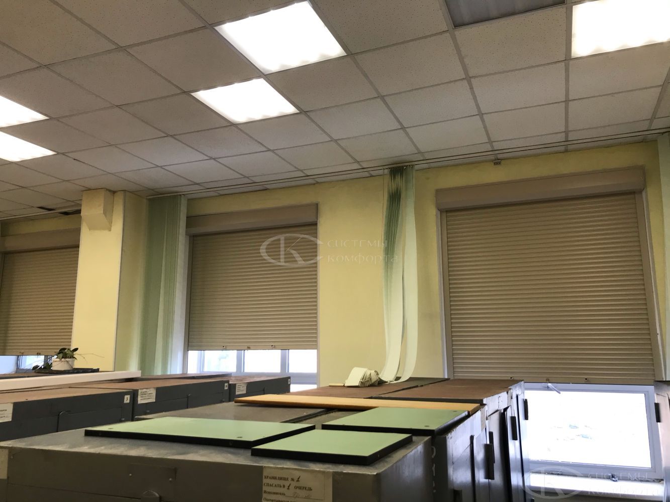 Роллеты устанавливаются в проем, направляющие крепятся к его торцевым частям, короб с полотном развернут наружу. Кожух не выступает за пределы окна, поэтому внешний вид здания остается неизменным. Однако при таком способе установки объем светового потока уменьшается на высоту короба и ширину направляющих шин.