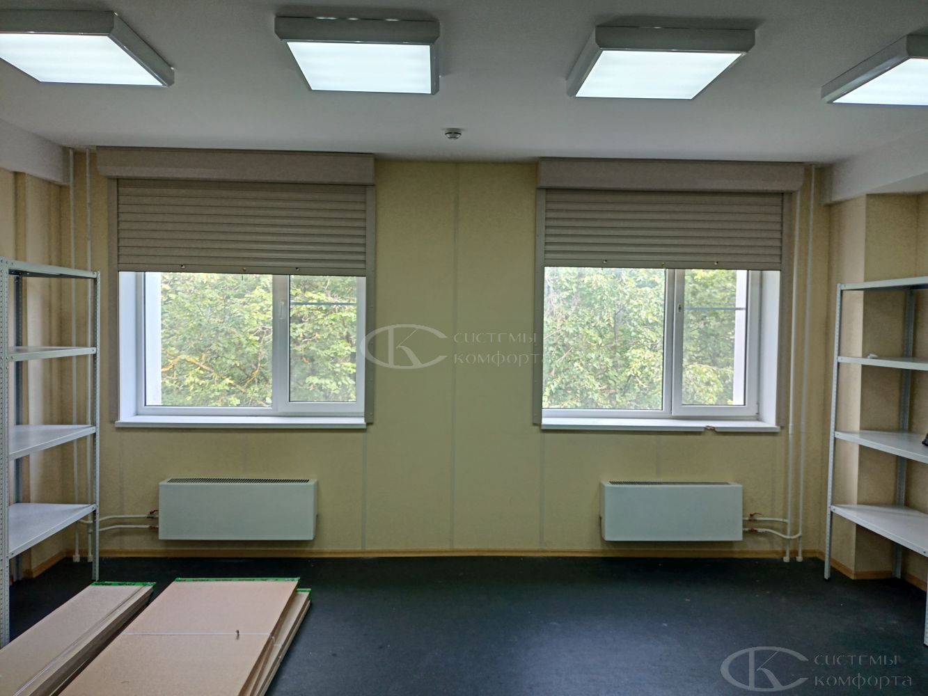 Устраивается неглубокая ниша в верхней части проема под футляр с полотном. Нижняя часть кожуха соответствует уровню верхней перекладины окна. Объем света сохраняется полностью. Короб также закрывает место стыка оконного блока и проема, увеличивая защиту от холода и сквозняков.