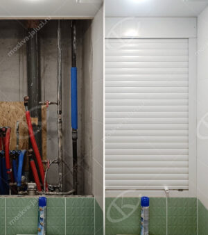 Наиболее выгодное решение – сначала установить рольставни, а затем пространство по бокам отделать плиткой. Это даст возможность избежать появления неровностей и обеспечить плотное прилегание чистового покрытия к коробу. Готовый результат смотрится эстетично, конструкция идеально вписывается в дизайнерское решение санузла.