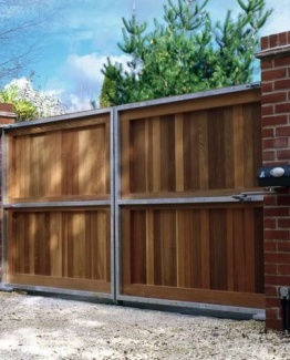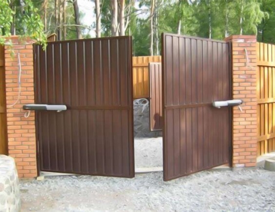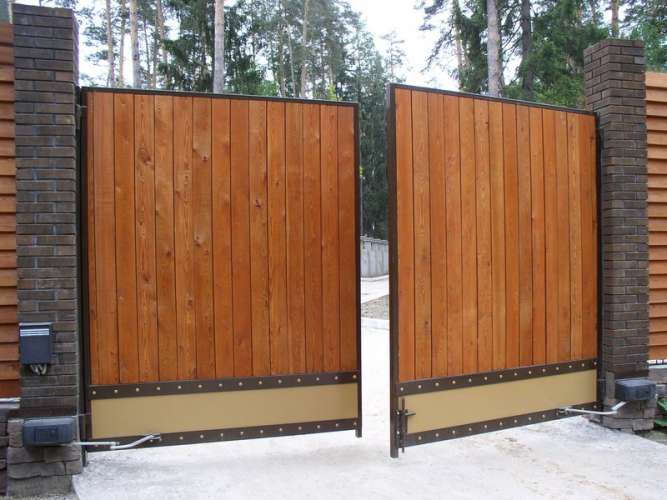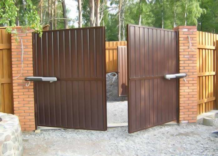 Распашные ворота состоят из двух створок, которые открываются наружу или внутрь, поэтому требуют дополнительного свободного пространства. Это классический вариант, который отличается простым монтажом и неприхотливостью. Распашные ворота оснащаются электроприводом. Полотна отличаются эстетичностью, повышенной надежностью и износоустойчивостью.