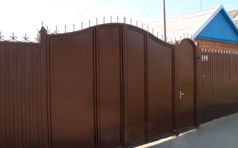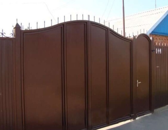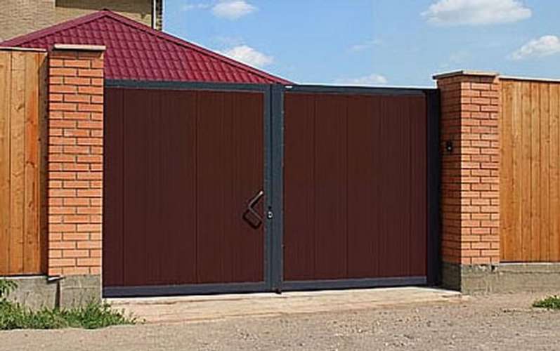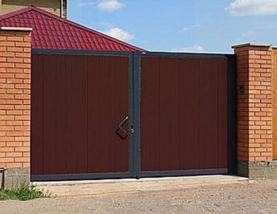 Самым популярным решением для дачных ворот остается профлист – это недорогой высокопрочный материал, который можно использовать в сочетании с металлической профильной трубой для ворот разной конфигурации. Благодаря многослойному покрытию он долго служит и не теряет первоначальной прочности: окрашенный лист не подвержен коррозии, его не нужно красить, он не боится частого контакта с атмосферными осадками.