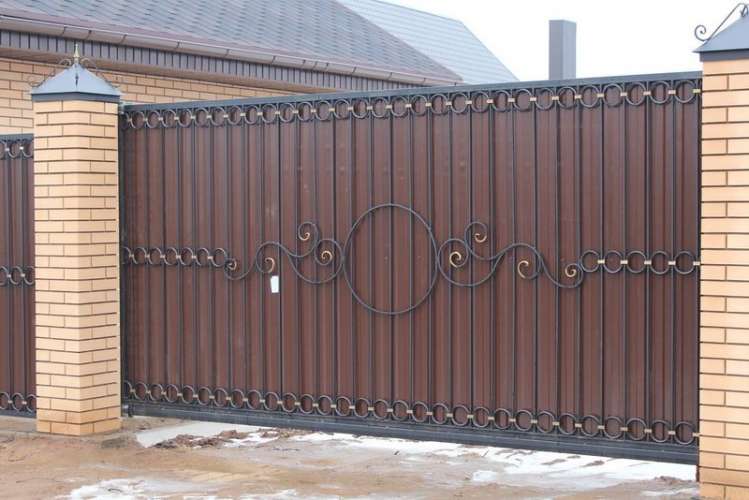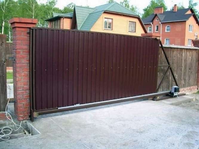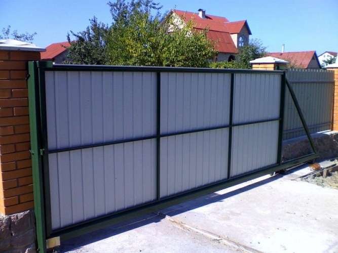 Еще один вариант – откатные ворота для гаража. От распашных они отличаются способом открывания: они не распахиваются, а откатываются в сторону, поэтому не требуется подолгу очищать пространство перед воротами от снега. Это удобный вариант, позволяющий сэкономить место на небольшом участке. Створка перемещается по направляющей, установленной на земле, также она может двигаться по металлической консоли.