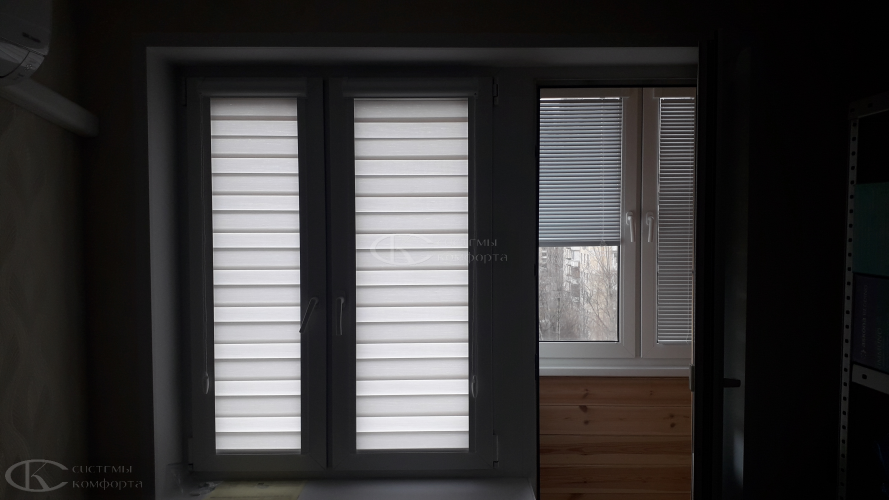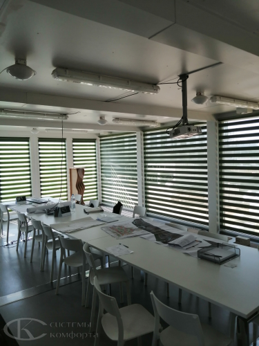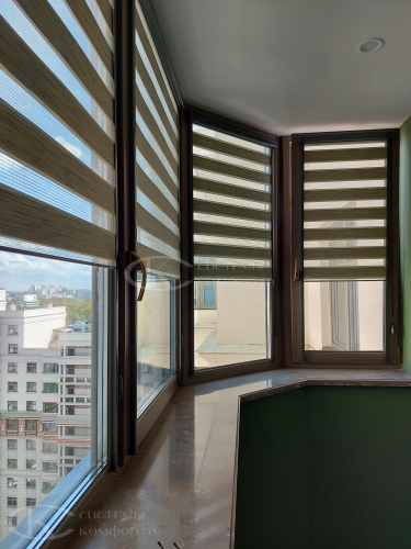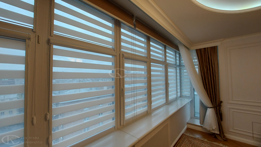 Это универсальные светозащитные системы, которые органично вписываются в любой интерьер. Комбинация поперечных чередующихся полос плотной и прозрачной ткани позволяет быстро и точно управлять светом, не жертвуя эстетикой.