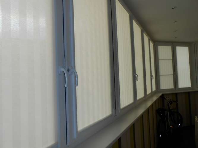 Достаточно дорогой вариант, сочетающий достоинства обычных пластиковых жалюзи и штор. Полотно собрано в чёткие складки, в опущенном виде выглядит как штора, а в собранном занимает минимум места. Особенно эффектно плиссированные жалюзи смотрятся на лоджиях с большой площадью остекления.
