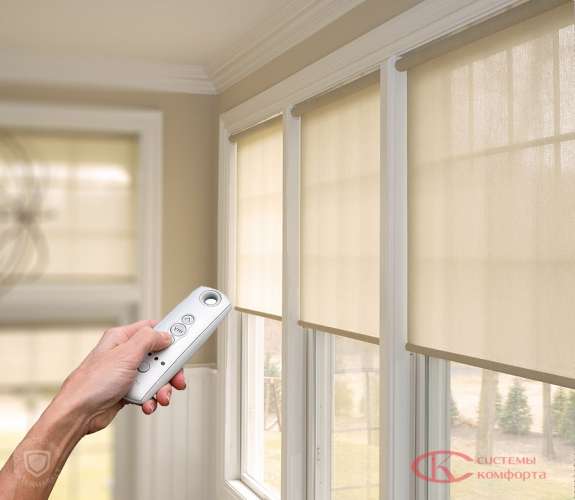 Рулонные шторы с электроприводом и дистанционным управлением оснащаются электромотором, который подключается к сети и приводится в движение после получения сигнала от контроллера. Привод запускает вращение вала, благодаря которому рулонное полотно поднимается или опускается. Такая система делает регулирование освещенности комнаты более комфортным. Процесс требует минимальных трудозатрат, благодаря управлению с пульта, приложения в смартфоне или голосового ассистента.