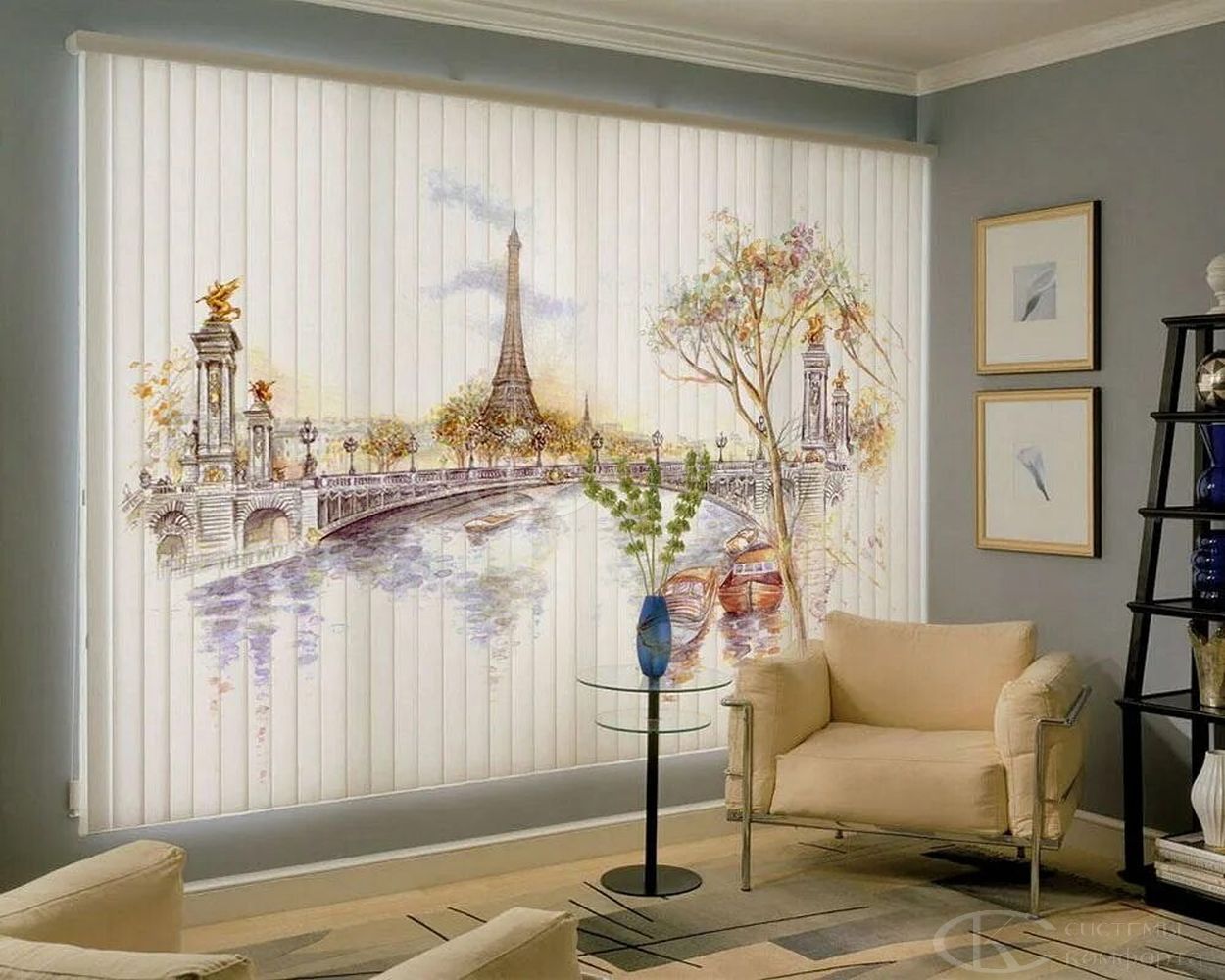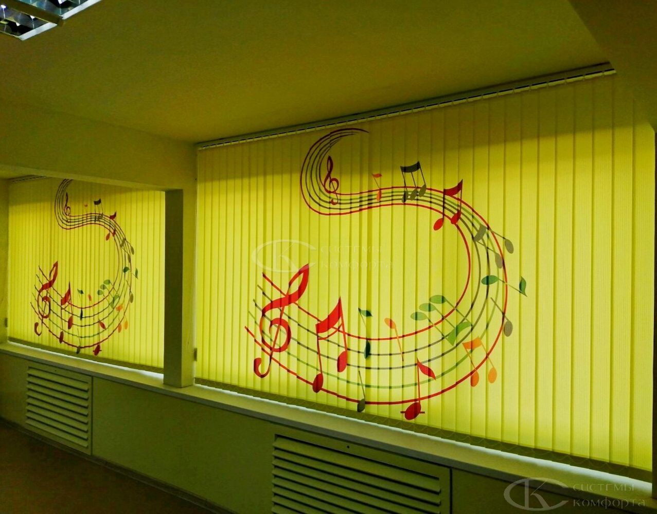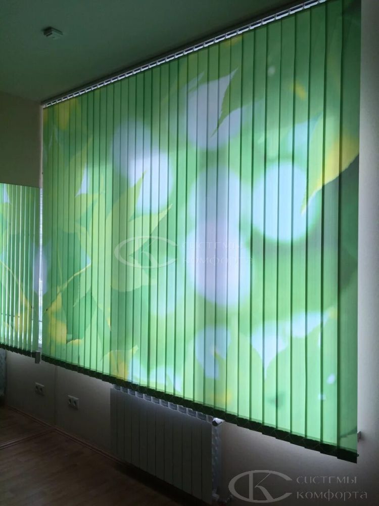 Наиболее часто используются в офисах. На такие жалюзи часто наносят логотип компании. Но вертикальные солнцезащитные системы могут применяться и в квартирах. В этом случае фотопечать делает ваш интерьер уникальным.